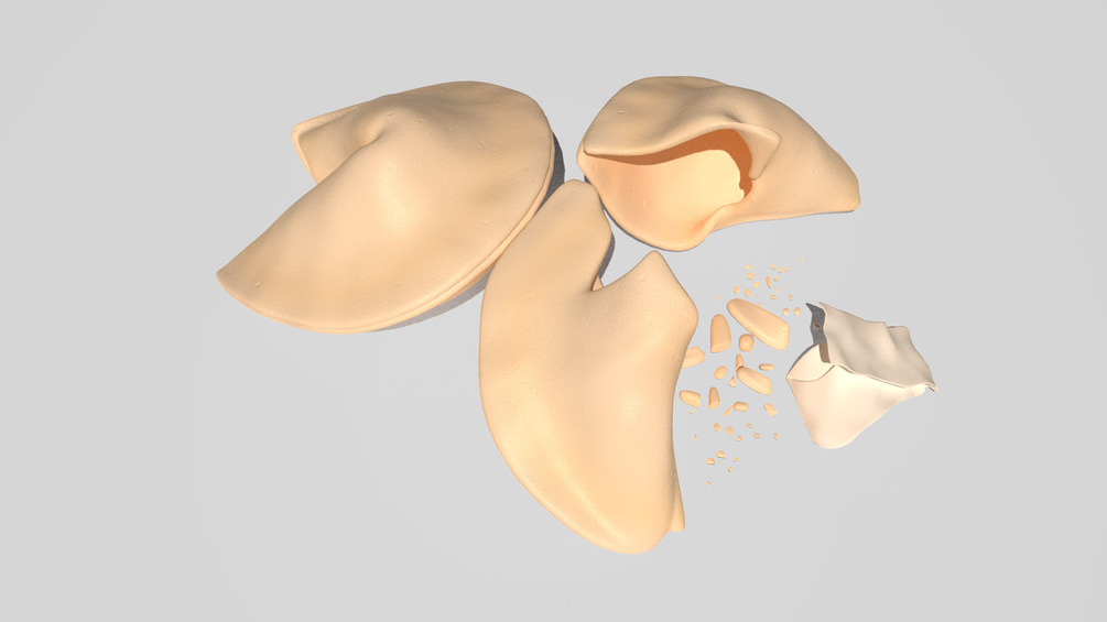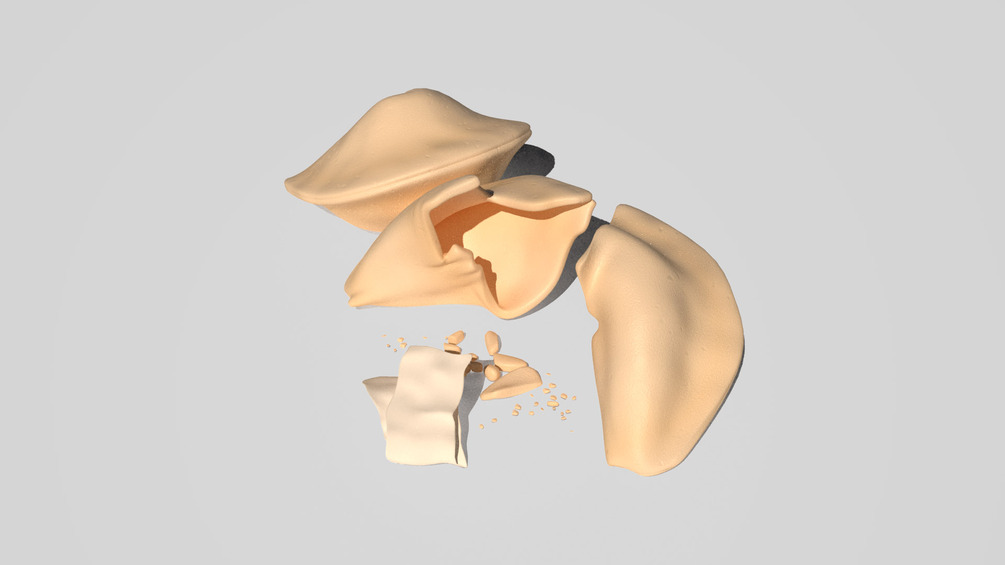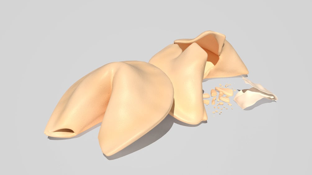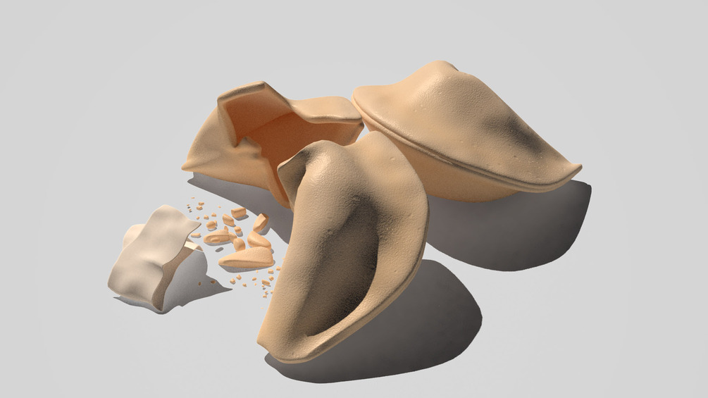 A fortune cookie model and scene. Included are broken cookies, crumbs and a piece of paper, as well as the scene in the shots